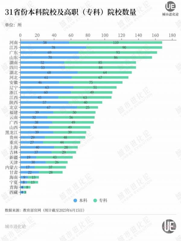 根据教育部发布的《全国高等学校名单》,到今年,广西共有87所普通高校,居于全国第17位,与河南、江苏两座高校大省相比,数量不足其168所的一半。而若将统计范围缩窄至本科高校,广西仅有38所,在全国排名也下降至18位。