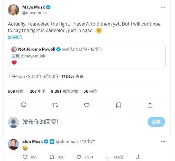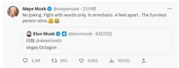 在马斯克发布约架推文第二天,老母亲就发第一条推文,劝马斯克这个“老小孩”冷静:
