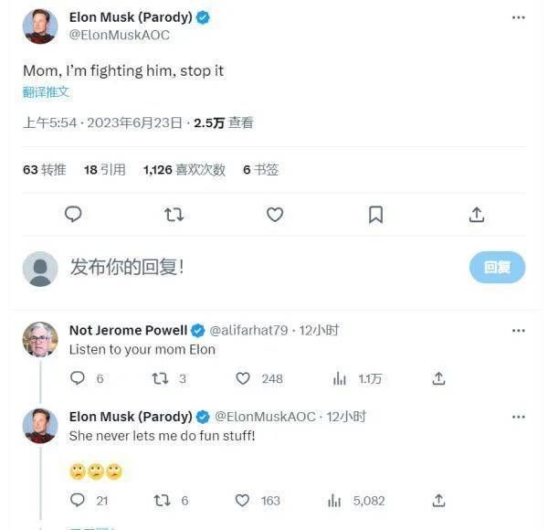 在这条推文下有位网友神评论:“听你妈妈的话。”马斯克回应他:“她从不让我做有趣的事情”。(这语气,有点像叛逆少年啊。)