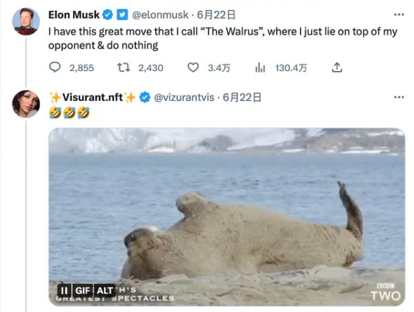 马斯克似乎也有自知之明,他在推特上发文称,“我有一个很棒的动作,我称之为‘海象’,我只是躺在对手身上什么都不做。”