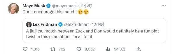 很快,马斯克的老妈出来阻止,紧接着,马斯克的老爸也出来劝阻。不过,也有看热闹不嫌事儿大的——体育博彩公司赶忙发布了他们的胜负赔率;UFC总裁达纳·怀特向两方确认“二人对此是非常严肃的”; OpenAI的CEO山姆·奥特曼不忘补刀,“如果两人真要决斗,自己会去看”……