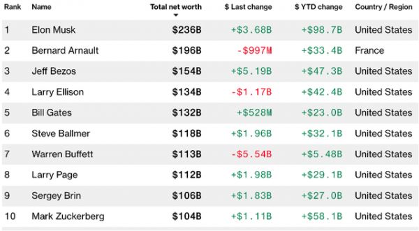 彭博亿万富豪榜最新数据显示,世界首富马斯克和排名第十的扎克伯格,身家相加达到3400亿美元。