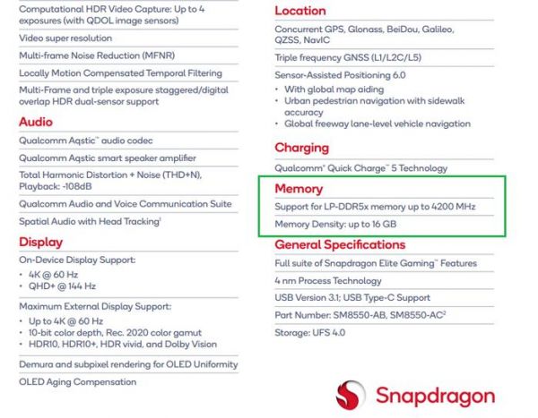 实际上,产业链上游早就准备好了超大内存。三星和美光已经将 LPDDR5 内存推高到了 128GB 以上,24GB LPDDR5X 也在今年第一季度开始大规模量产。而按照高通在官方文档中的说法,骁龙 8 Gen 2 的内存支持虽然「最高到 16GB」,不过骁龙 8 Gen 2 实际的物理内存上限为 32GB,完全可以满足对 24GB 超大内存的支持。