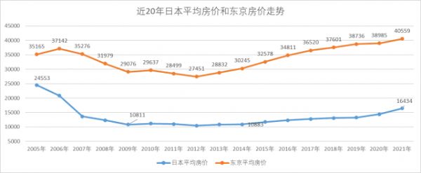 2005年~2021年日本的平均房价和东京房价的走势