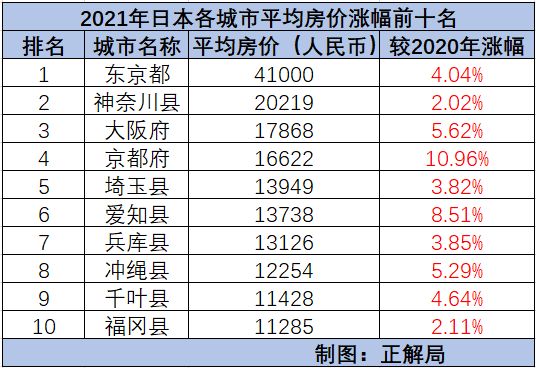 2021年,日本全国47个城市中,有13个城市的房价同比下跌,另外34个城市的房价同比上涨。