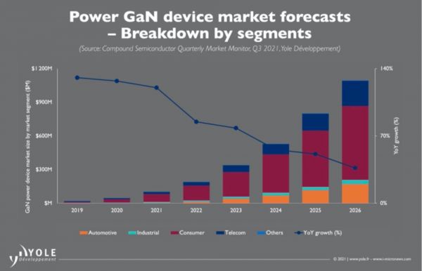 预计在2021年至2027年间,全球GaN功率器件市场的复合年增长率将达到30%,到2027年市场规模有望超过10亿美元,来源:Yole