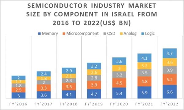 此外,仔细分析一下以色列的半导体市场。存储占据以色列半导体市场最大份额,其次是电源管理IC、逻辑芯片、OSD(On Screen Display)、以及模拟芯片。