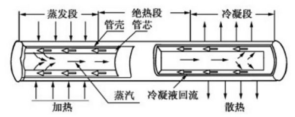 目前芯片级风冷散热模组中,导热器件主要以热管为主,它的主体是一根封闭、中空的金属管,内部有少量工作介质(主要是纯水)的毛细结构,运行时依靠介质蒸发吸收芯片热量,再由风扇将热量吹走。