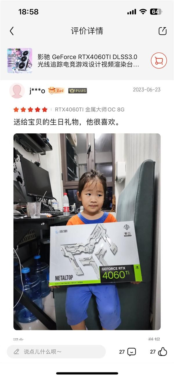 在某电商的RTX 4060 Ti金属大师OC显卡的评价中,一位网友晒出自己女儿手持这枚显卡的照片,并写道“送给宝贝的生日礼物,他很喜欢。”