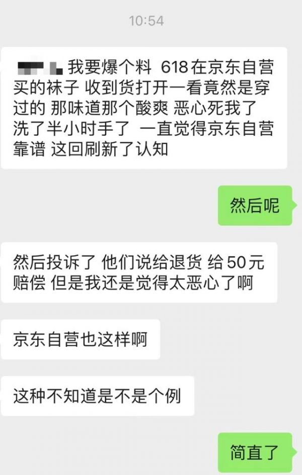 但近日却有消费者爆料称,“618在京东自营买的袜子收到货打开一看竟然是穿过的,那味道、那个酸爽恶心死我了,洗了半小时手了,一直觉得京东自营靠谱,这回刷新了认知。”