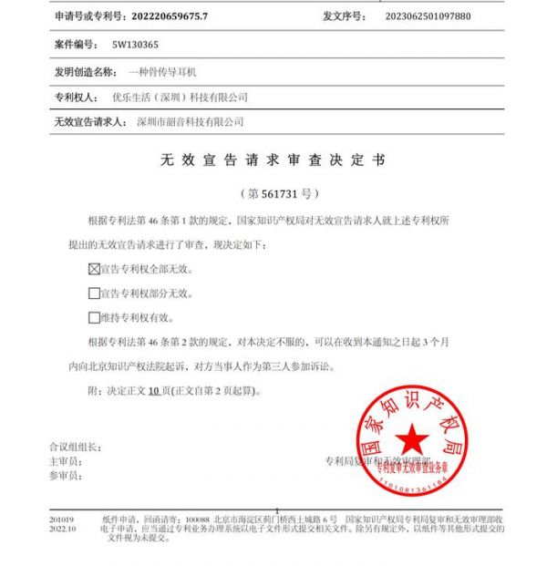近日,由北京三聚阳光知识产权代理有限公司、北京易聚律师事务所联合代理深圳市韶音科技有限公司与优乐生活(深圳)科技有限公司的又一件专利无效宣告结案。国家知识产权局作出第 561731 号无效审查决定,宣告优乐生活公司拥有的第202220659675.7号“一种骨传导耳机”实用新型专利权全部无效。