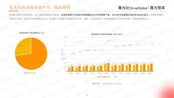 从电商关键环节物流来看,由于疫情及地缘冲突影响,北美电商第三方物流市场规模较2021年有稍微下滑,2022年市场规模已经达到3000亿美元。但将时间线拉长到10年来看,除2021年的跌幅23%之外,北美第三方物流市场是稳中有升的。