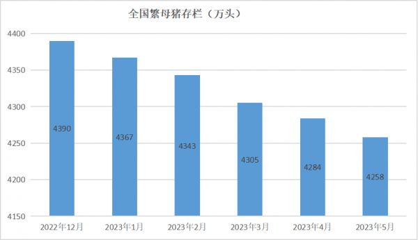 据2021年9月23日农业农村部发布的《生猪产能调控实施方案(暂行)》,全国能繁母猪存栏正常保有量为4100万头,能繁母猪存栏量处于正常保有量95%~105%区间为产能正常波动。也就是说,5月底母猪存栏量相当于正常保有量的103.85%。