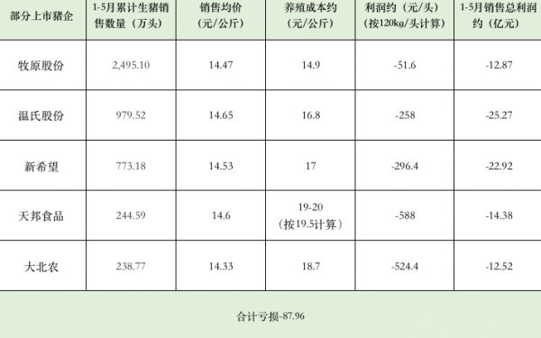 时代财经根据部分猪企披露的今年1~5月销售均价及养殖成本计算出,牧原股份、温氏股份(300498.SZ)、新希望、天邦食品和大北农5家猪企销售生猪合计亏损近90亿元。