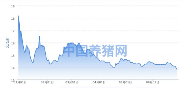 6月29日中国养猪网数据表示,全国生猪(外三元)价格为13.8元/公斤,每斤跌破7元大关,继去年10月底高位后,猪价已经跌了8个月。