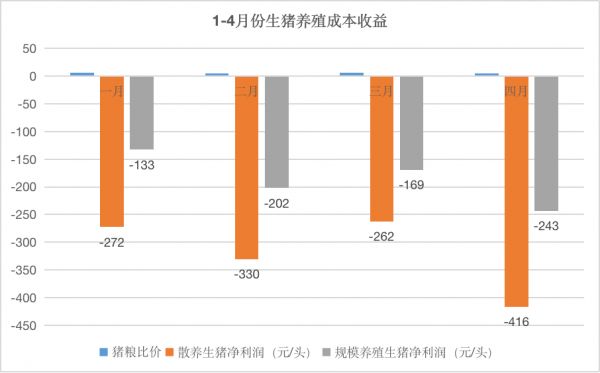 全国1~4月生猪养殖成本收益。数据来源:农业农村部,时代财经整理
