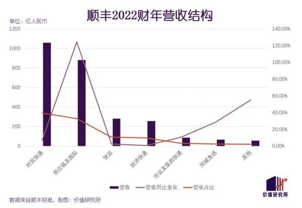 2022年年报显示,时效快递是顺丰主要收入来源,营收占比达到39.5%,其次是供应链及国际业务,占比32.8%,经济快递占比仅有9.6%。从收入增速来看,时效快递、供应链及国际也是最快的,前者达到6.8%,后者随着国际贸易的复苏和疫情的平复更是暴涨124.1%。
