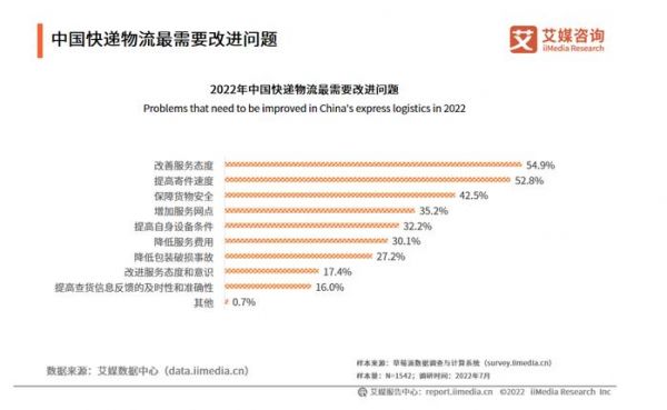 同样来自艾媒咨询的数据显示,针对快递物流行业最需要改进的问题的调查中,54.9%的用户希望改善服务态度,52.8%的用户希望物流企业提高寄件速度,占比排在前两名。往下数,还有不少用户希望保障包裹安全、提高信息准确性,反倒没有多少人在意性价比。