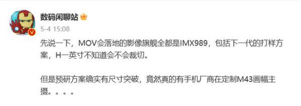 IT之家注意到,数码博主 @数码闲聊站 爆料称,新机搭载骁龙 8 Gen2 高频版,主摄将 IMX787 传感器换成尺寸更大的 Ultra Sensor。截至目前,最强大的 1 英寸传感器莫过于 IMX989,而该博主此前提到,有手机厂商在定制 M43 画幅(M4/3)主摄(物理尺寸为 17.3×13mm),但又表示短时间内不会落地。
