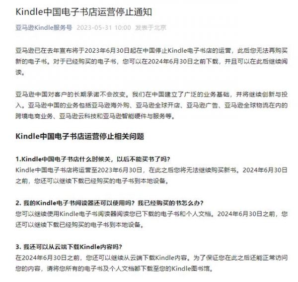 Kindle中国区的客服服务也将持续到2024年6月30日。