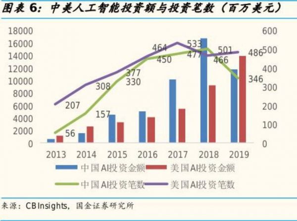 2016年,阿尔法狗战胜李世石后,AI领域掀起了一股投资热潮。A股市场机器人等公司股价因此上涨。2017年,一级市场,中美两国的AI投资笔数分别达到了477笔和533笔,金额分别超过100亿美元和50亿美元。
