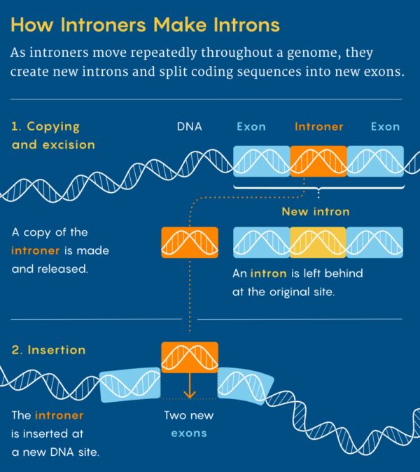 图3. Introner如何“制造”内含子? Introner把内含子序列插入基因组中,从而“割裂”原有的DNA序列,生成新的外显子。图源:Merrill Sherman