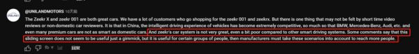 虽然不知道极氪X卖到欧洲去车辆,是否也会需要用户“氪服一下”,但海外的网友们对于滑动屏幕等花哨设计的态度,仍然处于“你买我推荐,真买我不买”的状态。