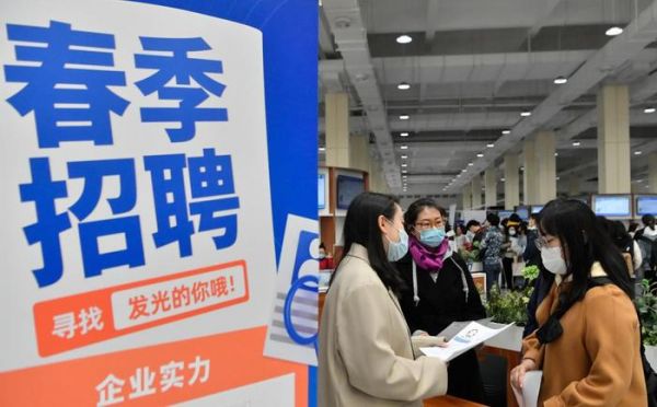 3月25日,在中国(天津)人力资源发展促进中心,招聘企业工作人员与求职者交流。新华社记者孙凡越 摄