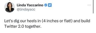 5月底,亚卡里诺就发布过一条推文:“作为一个习惯穿4英寸高跟鞋的人,让我们明确一点:我不会摇摇晃晃。”(温馨提示,4英寸约等于10厘米。)上任之后,亚卡里诺又发推特“让我们坚持自己(不管是4英寸还是平底),共建推特2.0”。此处“坚持自己”英文dig our heels in直译是“把鞋跟踩进去”,亚卡里诺玩了个双关。