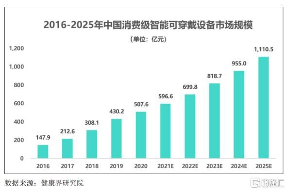 参考消费级智能可穿戴设备的市场情况,2016-2020年,我国消费级智能可穿戴设备市场规模增至507.6亿元,年复合增长率达36.11%;得益于消费者对健康保养需求的日常化和大众化,这一市场规模预计保持较快增速,到2025年达到1110.5亿元。