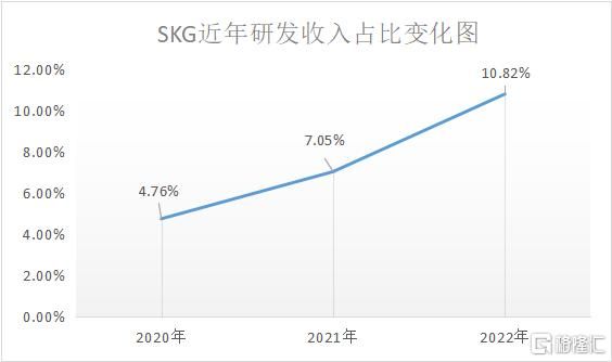 截至2022年12月,SKG共有研发人员172人,占总体员工的22.78%;2021年,SKG研发投入达7472.59万元,占收入的比重为7.05%,2022年这一数据达到9785.81万元,占比进一步提升至10.82%。