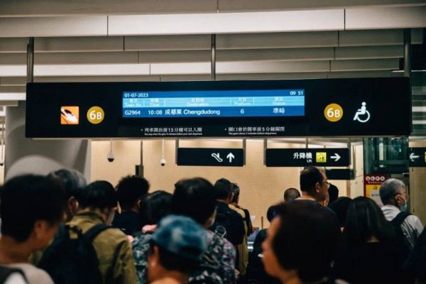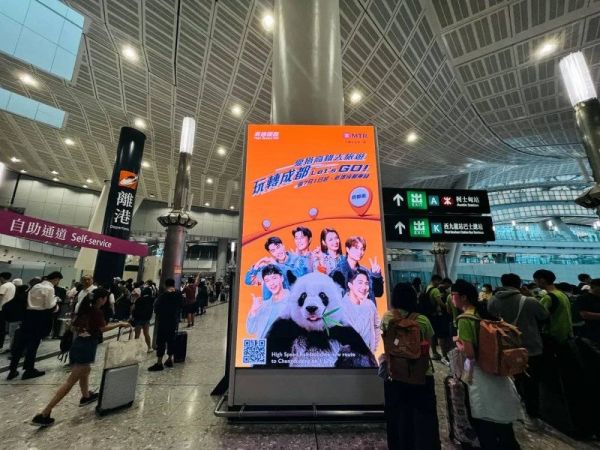 7月1日上午,西九龙站里排满了等待出行的旅客。显示屏上,几个年轻人围在“大熊猫”身边,配上“玩转成都”的标语,意在提醒过往来客——香港与成都通高铁了。