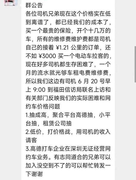 在深圳的司机群里,一些司机说:“高德打车为了市场份额运价一降再降……其恶意倾斜行为极度拉低网约车整体运价”。
