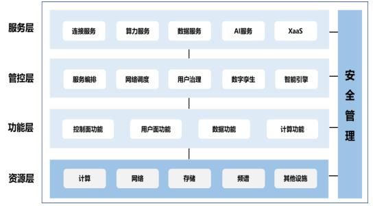 6G网络系统架构图目前,业界已广泛共识,未来6G网络在传统连接能力基础上,将衍生扩展内生的感知、智能、计算、安全等多维能力,对6G网络架构提出了颠覆以往传统网络架构的创新要求。网络架构设计是6G网络能否显著提升网络能力赋能社会发展的核心关键。目前,空天地海一体、通感算一体、数字孪生、智能内生等实现6G愿景的关键技术方向已逐渐形成共识,但是如何将这些潜在技术有机融合形成6G网络的总体架构设计还在探索阶段。