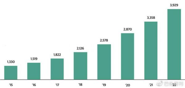如今,我们也可以用同样的方式看待人工智能和数据中心。生成式人工智能模型依赖于强大的数据处理能力和大规模的储存容量,这应该会推动市场对一些实体数据中心的需求。这些实体数据中心需要有能力处理生成式人工智能应用的密集计算需求。同时,它们还能够实现分布式训练与推理,有效协调跨多台机器或多个数据中心的操作。近年来,随着储存和计算需求向云端转移,对数据中心的需求也急剧增加。如下图所示,据世邦魏理仕(CBRE)估计,自2015年以来,数据中心库存数量几乎增长了两倍。