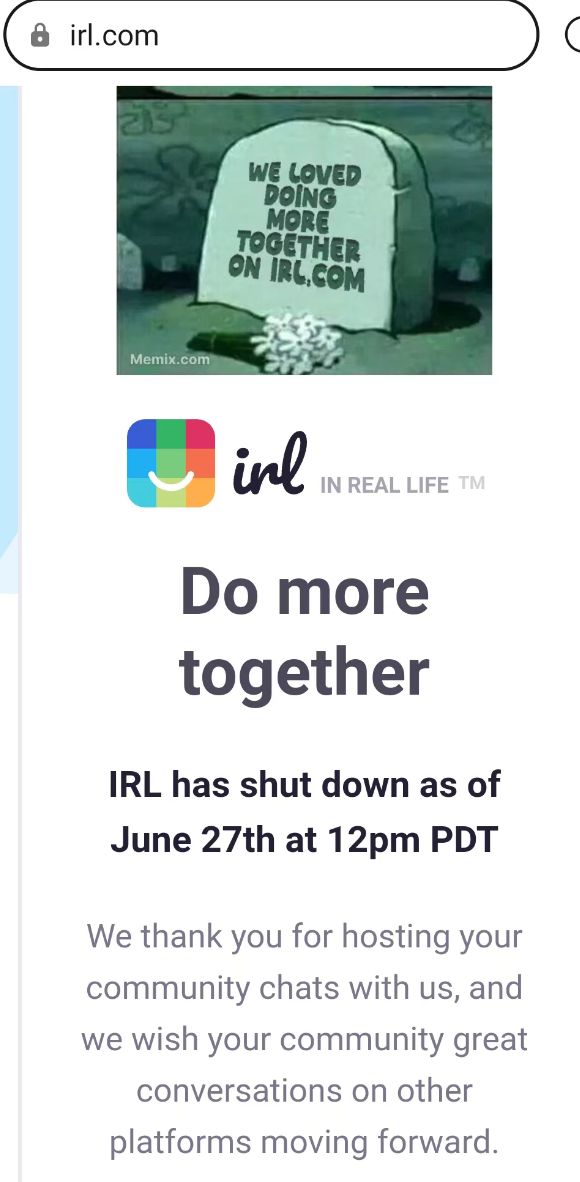 目前,IRL官网已显示“6月27日中午12点关闭”。IRL应用程序已从iOS应用商店中删除。
