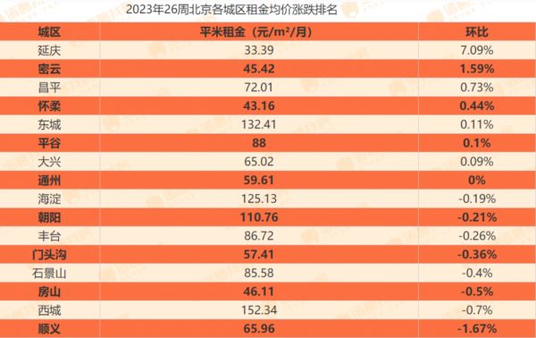 据诸葛找房数据,2023年第26周(6月19日~25日),北京租金均价为98.53元/平方米/月,环比上涨0.12%。其中,西城以152.34元/平方米/月的租金价格高居首位;东城其次,租金均价为132.41元/平方米/月;延庆租金价格最低,为33.39元/平方米/月;西城租金是延庆的4.56倍。但各个区域租金的环比变动都维持在2%以内,波动并不明显。