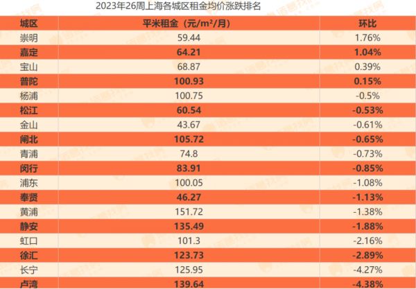 据诸葛找房数据,2023年第26周(6月19日~25日)上海租金均价为100.32元/平方米/月,环比下跌1.98%,各城区租金差异较为显著。其中,黄浦以151.72元/平方米/月的租金价格高居首位;卢湾其次,租金均价为139.64元/平方米/月;金山租金价格最低,为43.67元/平方米/月。
