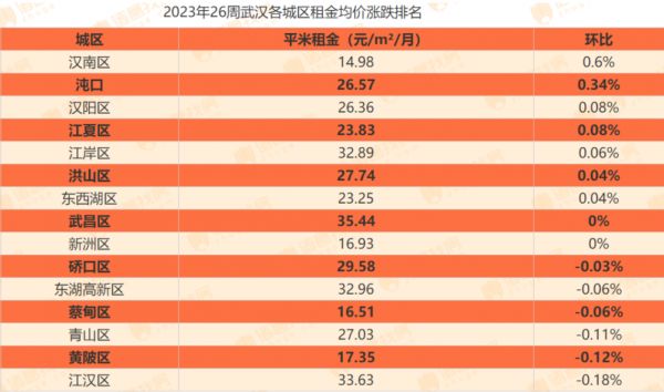 据诸葛找房数据,2023年第26周(6月19日~25日),武汉租金均价为30.43元/平方米/月,环比下跌0.03%,各城区租金差异较为显著。其中,武昌区以35.44元/平方米/月的租金价格高居首位;江汉区其次,租金均价为33.63元/平方米/月;汉南区租金价格最低,为14.98元/平方米/月,武昌区租金是汉南区的2.37倍。从租金涨跌变化来看,汉南区涨幅最大,为0.6%;其次是沌口,租金上升0.34%;跌幅最大的是江汉区,环比下降0.18%。