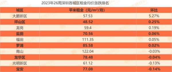 据诸葛找房数据,今年第26周(6月19日~25日),深圳租金均价为92.1元/平方米/月,环比上涨0.22%。不过,各城区租金差异较为显著。其中,南山以122.04元/平方米/月的租金价格高居首位;福田其次,租金均价为111.35元/平方米/月;坪山区租金价格最低,为48.52元/平方米/月。