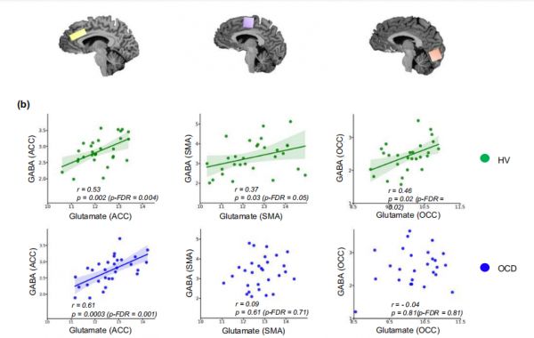 健康与强迫症大脑前扣带皮质、辅助运动区及枕皮质谷氨酸与GABA的关系