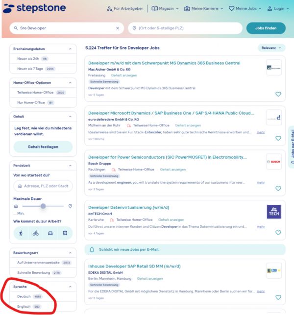 德国目前有不少职位是可以用英语应聘的,可以在目前德国正火的招聘网站StepStone(stepstone.de)上搜索,输入对应的职位名称(比如SRE Developer),在左侧选择工作语言为英语(Sprache-Englisch)就可以。当然你也可以指定更多查询条件,比如工作经验、工作所在地点、是否支持全远程办公等等,寻找更有兴趣的内容。