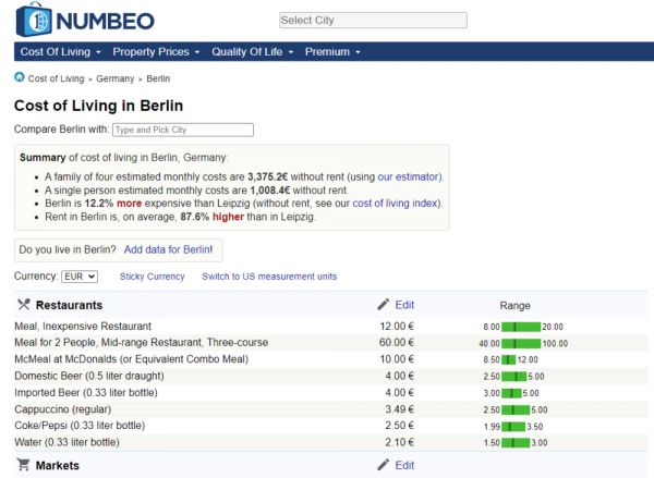 如果你希望了解德国某地的生活成本,可以在Numbeo网站(numbeo.com)查询,这里几乎囊括了世界上主要城市的生活成本,而且不断更新。