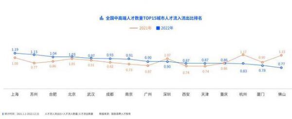 从城市分布来看,一线城市仍然是中高端人才聚集地,二线城市对中高端人才的吸引力在上升。北京上海成为中高端人才存量最大的两个城市,深圳紧随其后,杭州位居第四。南方城市占据前十中的八席,北方城市仅有北京、西安入榜。2022年,苏州、合肥的中高端人才从净流出逆转为净流入。