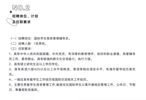 天津某高校国际学生宿舍管理辅导员任职要求/截图源自中天人力公众号