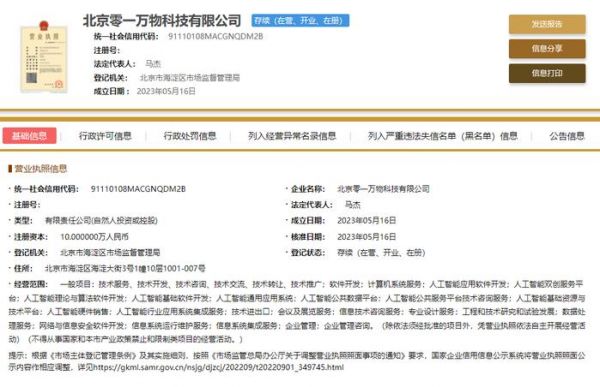 创新工场董事长兼 CEO 李开复于今年 3 月下旬正式宣布,以 Project AI2.0 之名入局大模型,“零一万物”正是这家创业公司的正式公司名。公开资料显示,“零一万物”公司主体注册地址位于北京,所属行业为科技推广和应用服务业。
