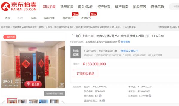 在刚刚过去的周末,据京东拍卖网,“上海市中山南路566弄7号2501室房屋及地下2层1130、1132车位”以1.58亿元的价格成交,较起拍价1.25亿元溢价26.4%。根据成交价计算,该套房产的成交均价达到34.4万元/平方米。