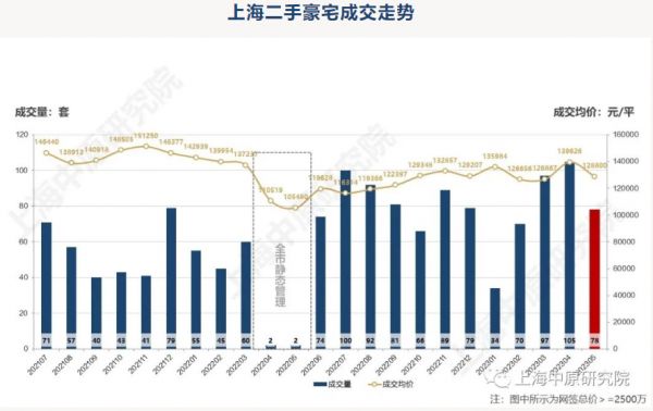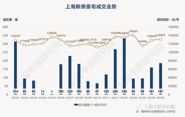 从上海豪宅市场的表现来看,据上海中原地产统计,今年5月上海新房豪宅市场呈现供应骤降,2500万元及以上高端房源供应113套,环比上月锐减52%;不过,新房总价2500万元以上房源共成交187套,环比上涨16%;成交均价130925元/平方米,均价环比涨幅约2%。