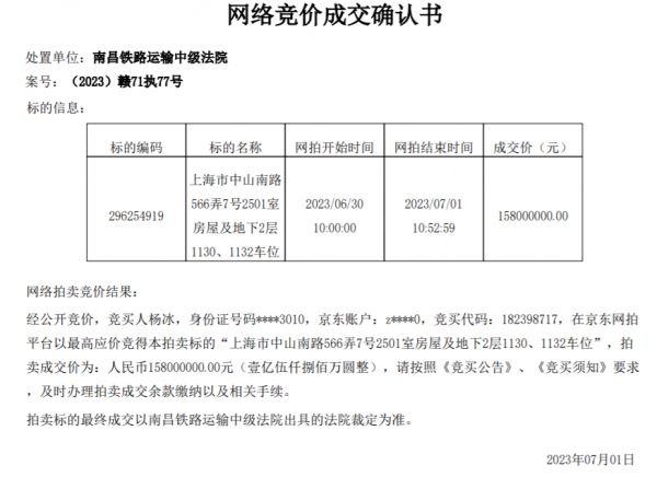 京东拍卖的网络竞价成交确认书显示,经公开竞价,竞买人杨冰,在京东网拍平台以最高应价竞得本拍卖标的“上海市中山南路566弄7号2501室房屋及地下2层1130、1132车位”,请按照《竞买公告》、《竞买须知》要求,及时办理拍卖成交余款缴纳以及相关手续。