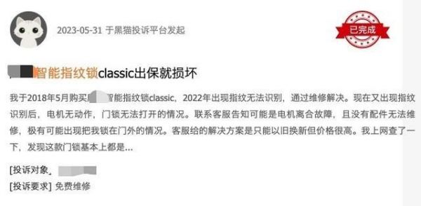 过保就坏,同样是智能门锁最容易出现的问题之一,特别集中于某个系列的智能门锁上。这种的原因大概率就是那批产品的品控有问题,个人认为品牌全锅。这也主要“得益”于前几年智能门锁野蛮发展,后续相关问题才能持续爆出。在此类投诉上,厂商一般会选择进行后期免费维修,当然也有少数小品牌选择直接跑路……